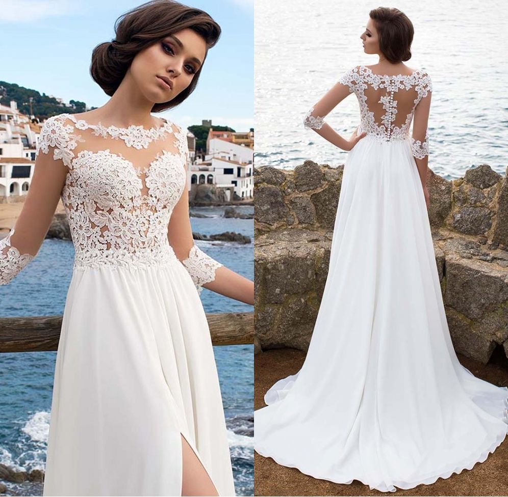 Discount 3 4 Long Sleeves Beach Bohemian Wedding Dresses 2019 Chiffon Scoop Neck Appliques Long Bridal Gowns With Side Split Alternative Wedding