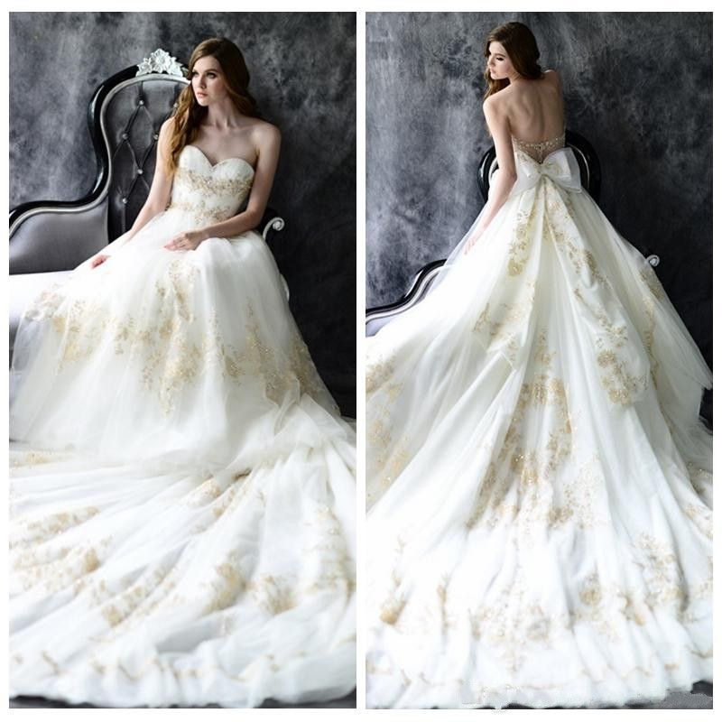 Discount 2019 New Vogue Real Photos Gold Lace Appliques A Line Wedding Dress Chapel Train Garden Bow Back Long Bridal Gowns Custom Made Online E26